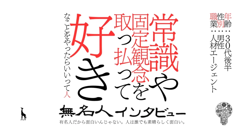 先日、無名人インタビューさんにインタビューをしていただきました。 「有名人だから面白いんじゃない。人は誰でも素晴らしく面白い」というコンセプトをもとに、どなたでもインタビューを実施しているメディアです。 私の個人的な生い立ちや考えの変化、... -